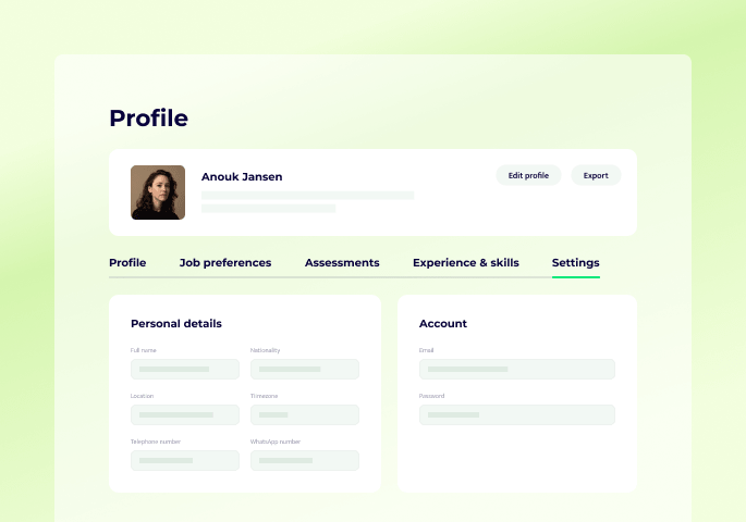 Sign up for free, add your experience and languages, and complete your profile to get matched with the right roles.